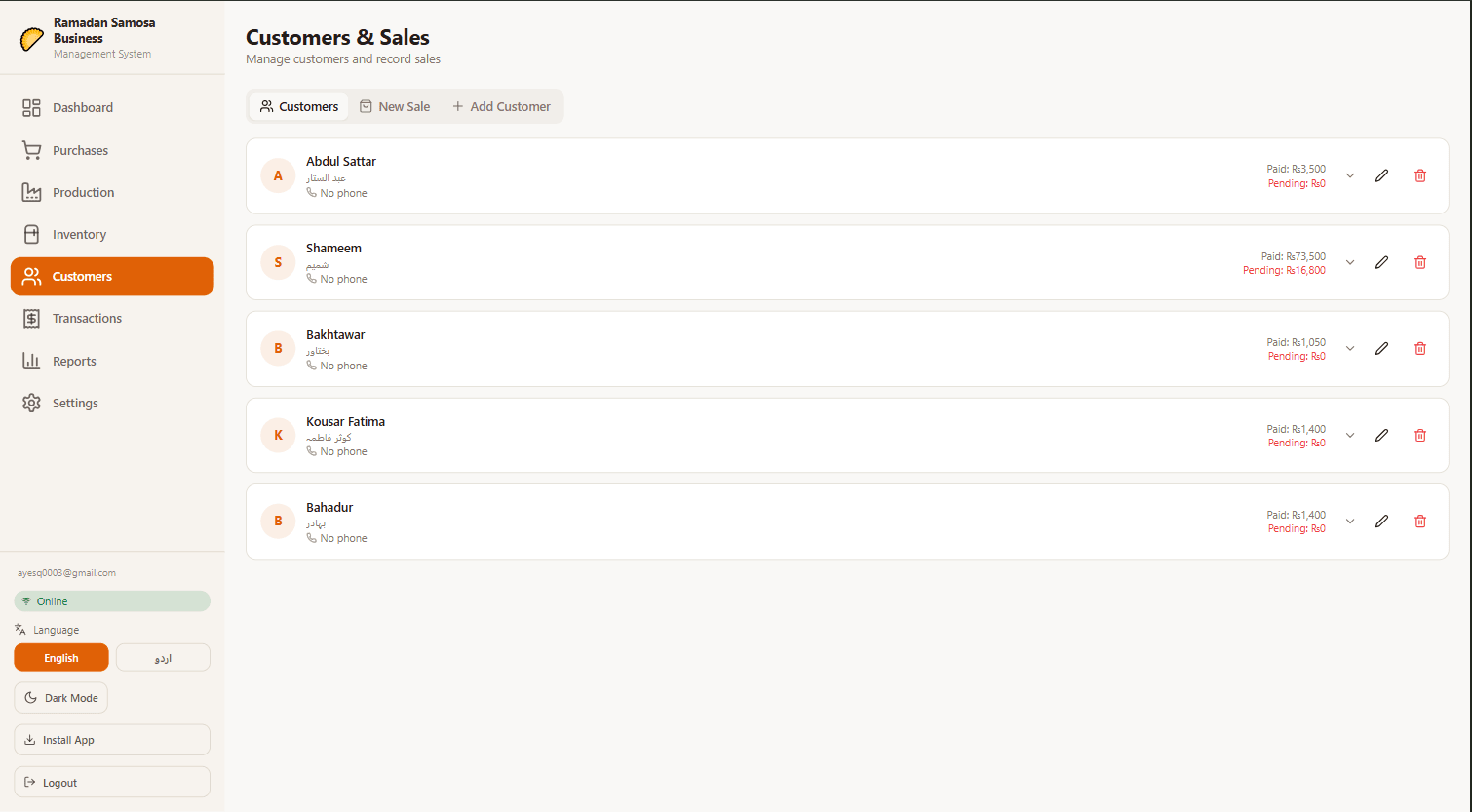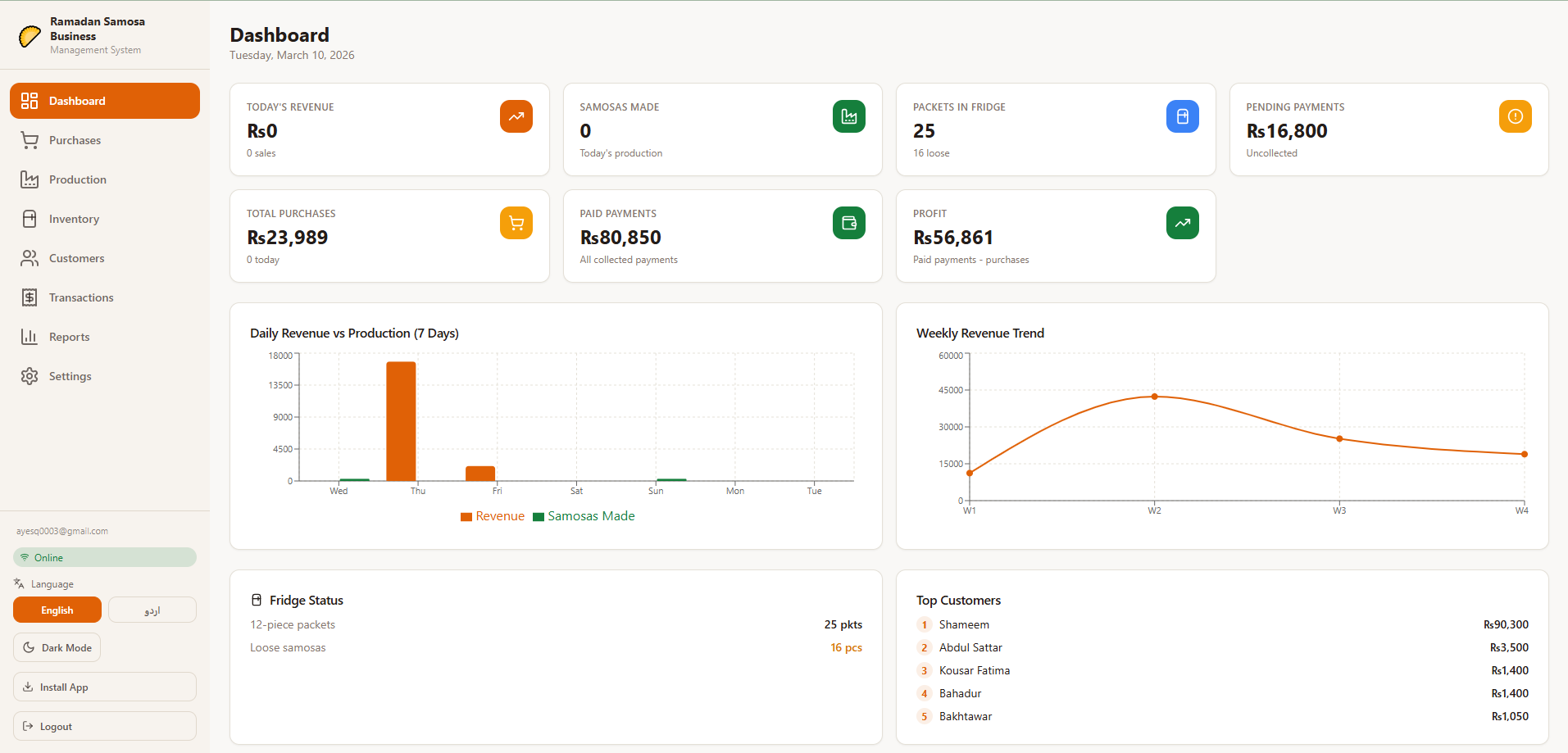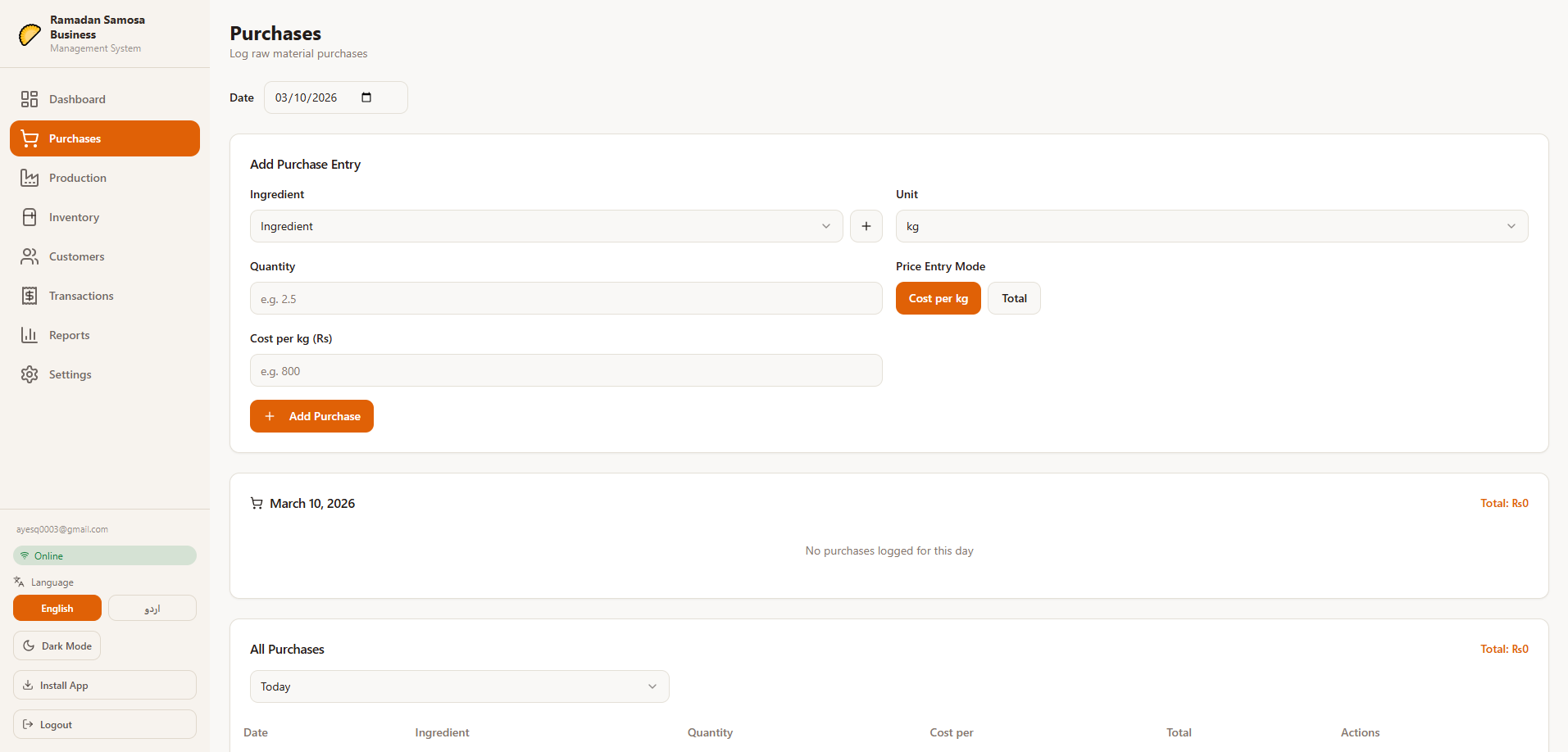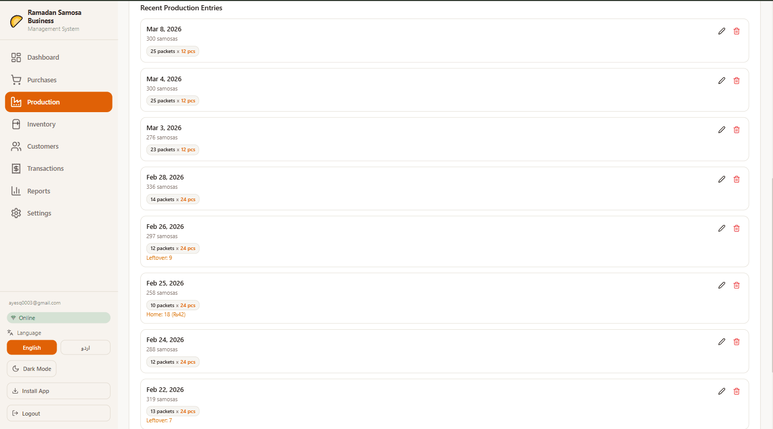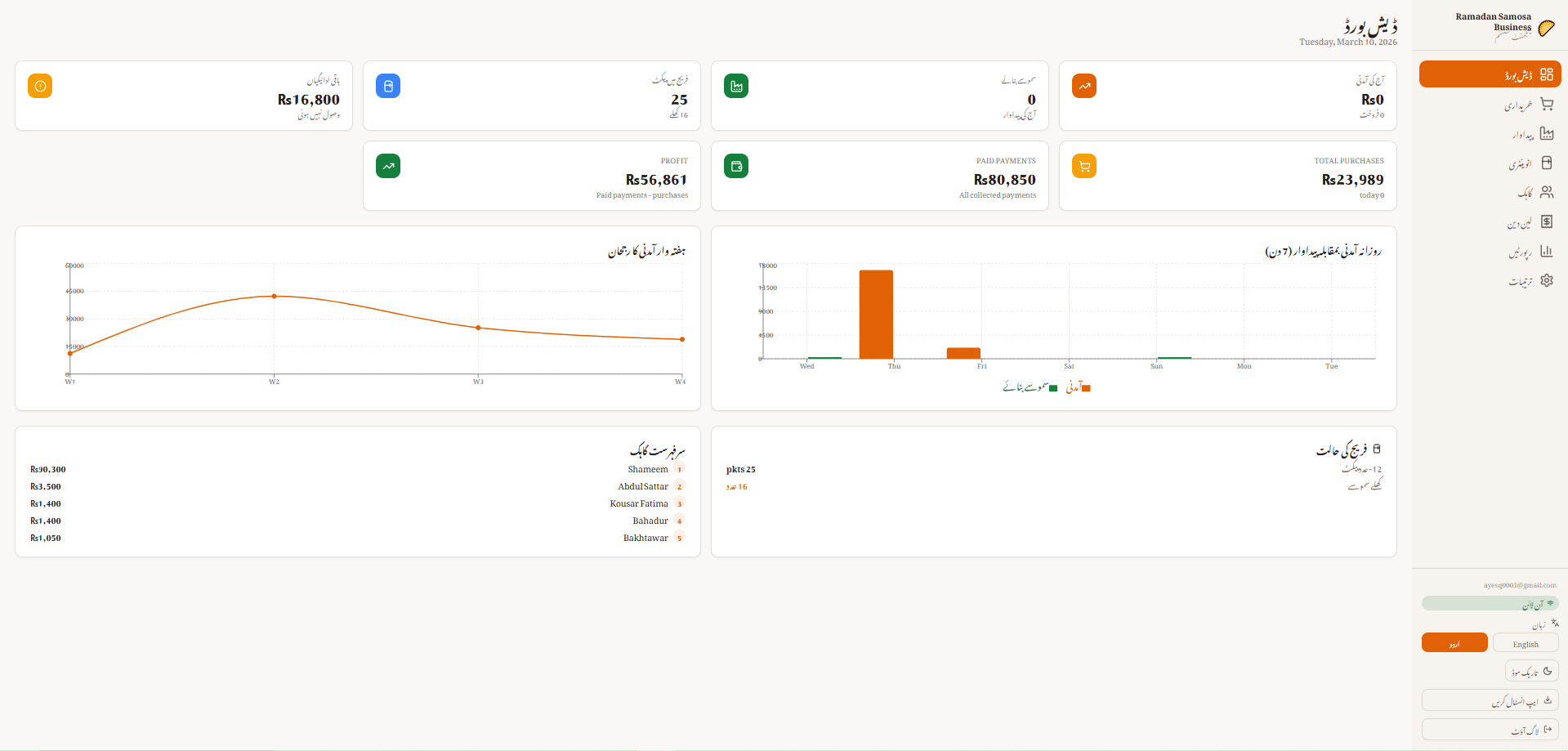 نظام إدارة المخبز هو نظام متطور لإدارة الأعمال يعتمد على السحابة، ومصمم خصيصًا لمؤسسات إنتاج السمبوسة الصغيرة إلى المتوسطة. تجمع هذه المنصة المتقدمة بين التحليلات في الوقت الفعلي، وبنية تعمل دون اتصال أولًا، ودعم متعدد اللغات، ومزامنة سحابية بمستوى المؤسسات، لتقديم تجربة تشغيل سلسة. صُمّم مع مراعاة مرونة روّاد الأعمال وقابلية التوسع، حيث يُمكّن مجموعة نجاح السمبوسة أصحاب الأعمال الغذائية من تحسين سير عمل الإنتاج، وزيادة الربحية، وتوسيع العمليات بثق