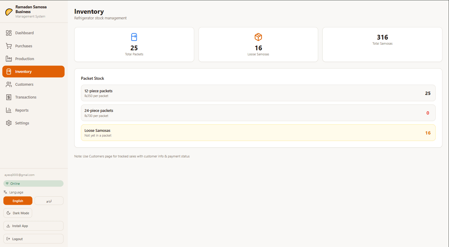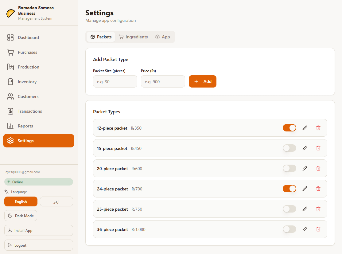 - Add Packet Types: Create samosa packet sizes (e.g., 5, 10, 20, 50 pieces)
