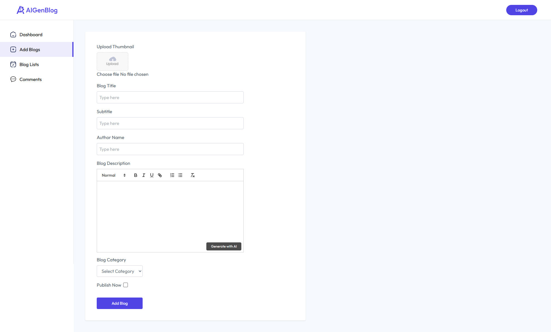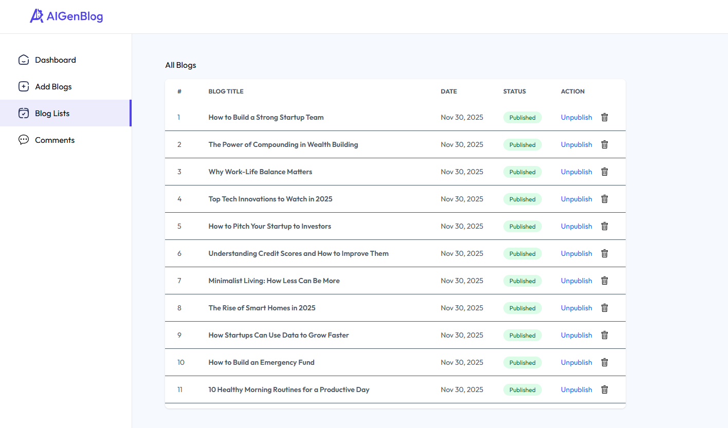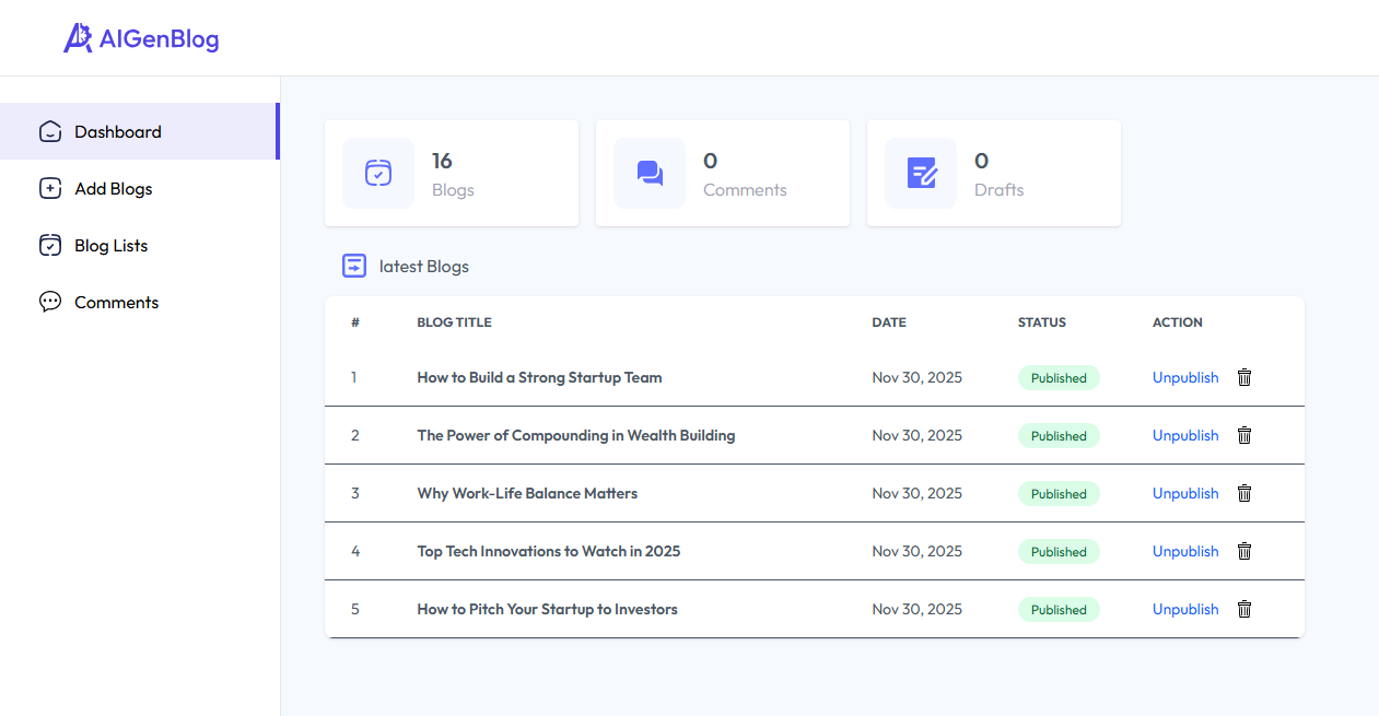 - Manage Blogs: Edit, delete, and publish/unpublish blogs
