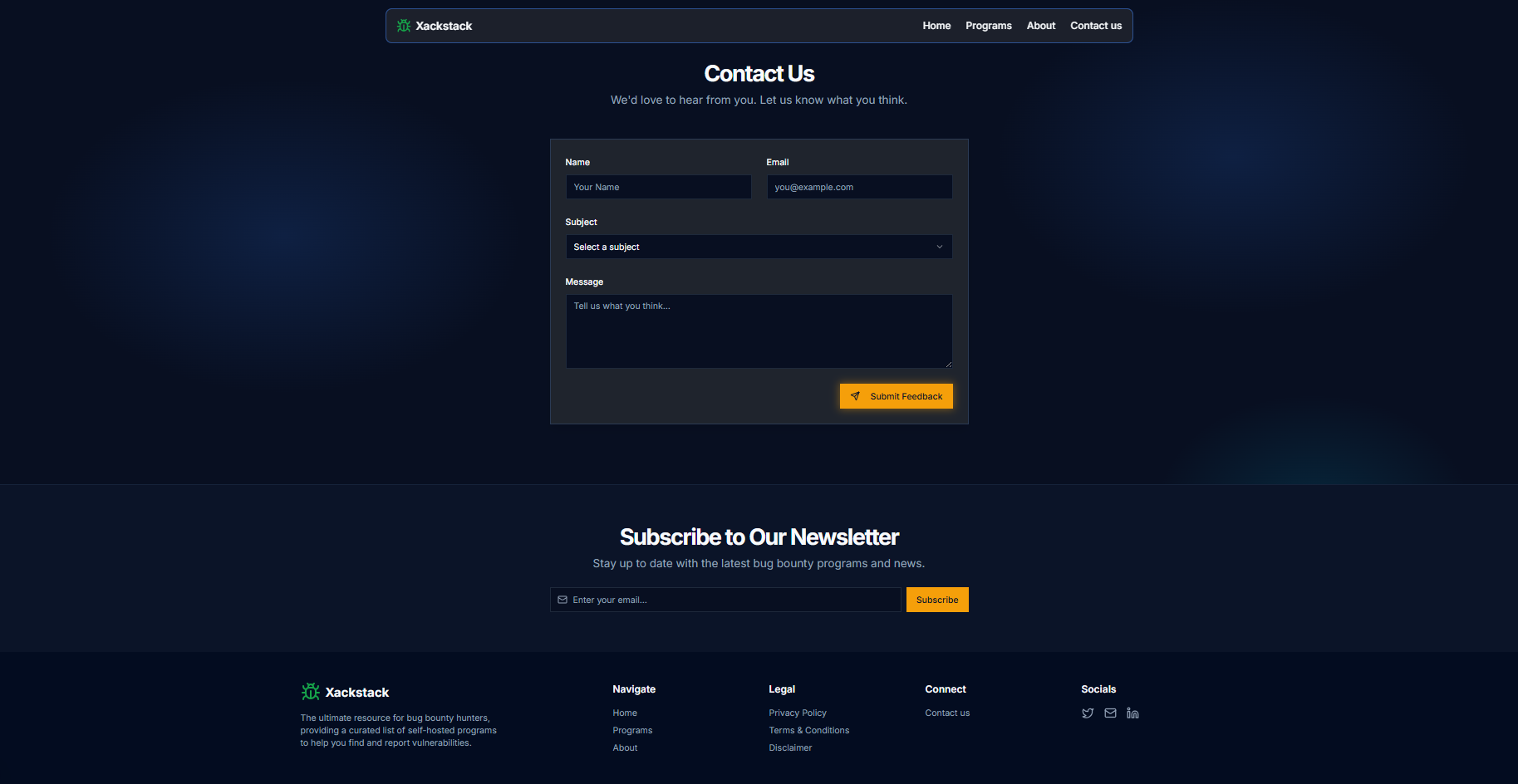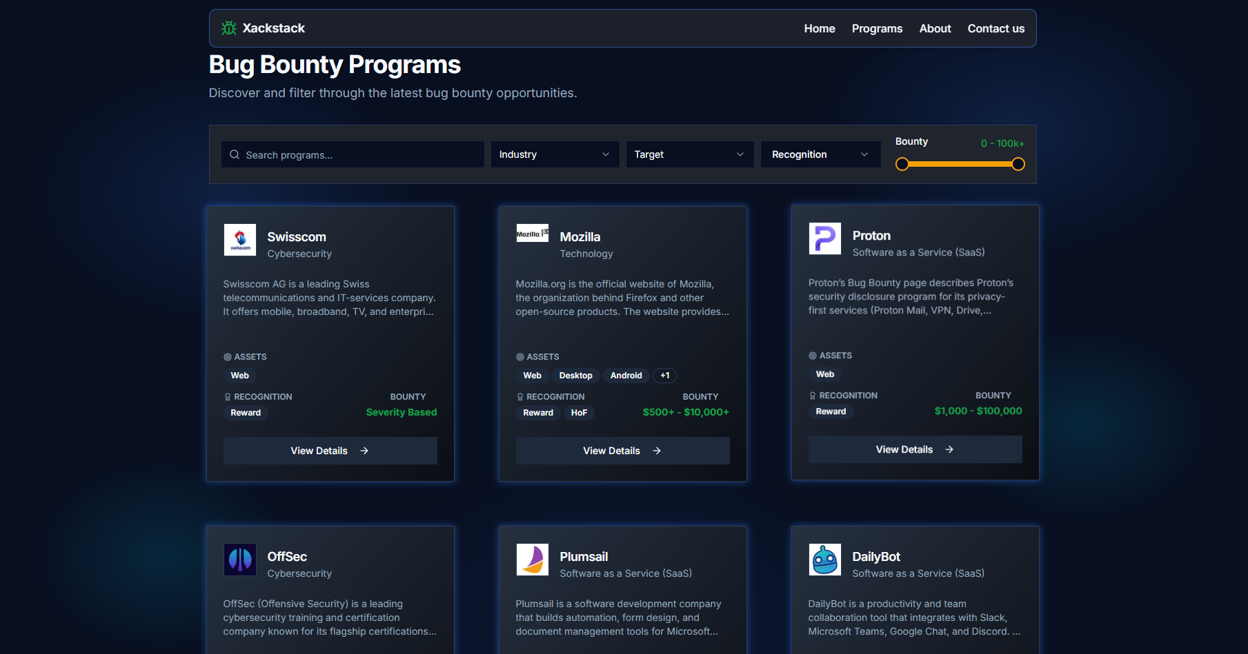 This platform solves that problem by providing a single, curated, and structured source of truth. We handle the discovery, so you can handle the disclosure. XackStack is a comprehensive directory of self-hosted bug bounty and vulnerability disclosure programs, complete with advanced filtering and a clean, consistent interface.